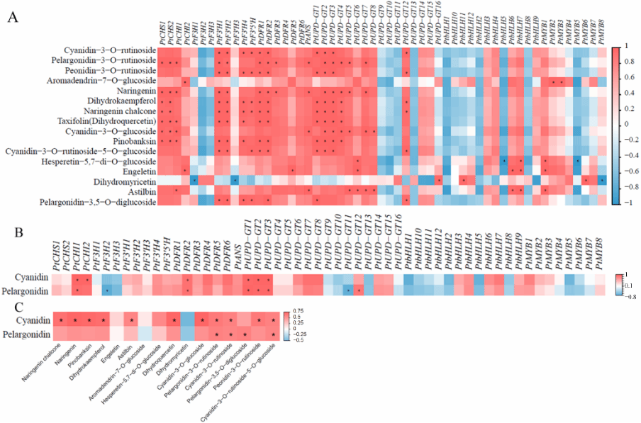 以半夏全长转录组为参考,对二代测序数据进行比对分析,推测PtCHS1、PtCHS2、PtCHI1、PtDFR5、PtANS、PtUPD-GT2、PtUPD-GT3对半夏花青素的积累有重要贡献;PtF3′5′H、PtDFR2、PtUPD-GT1可能是半夏块茎红色表皮的形成的关键酶基因;PtbHLH1和PtbHLH2对红半夏中花青素的生物合成具有调节作用(图3)。转录组、代谢组联合分析发现,PtCHS1、PtCHS2、PtCHI1、PtF3′H1等13个DEGs与花青素生物合成途径中的DAMs成显著正相关,且PtCHS1、PtCHS2、PtCHI1、PtF3′H1、PtF3′H2、PtF3′H4与它们编码的酶产物呈显著正相关(图4A)。在上述的DEGs中,PtCHI1、PtDFR2、PtUPD-GT1、PtUPD-GT2、PtUPD-GT3与矢车菊素、天竺葵素含量呈显著正相关关系(图4A);PtCHI1、PtDFR2、PtUPD-GT3编码酶的产物也与矢车菊素、天竺葵素含量呈显著正相关关系(图4B)。
