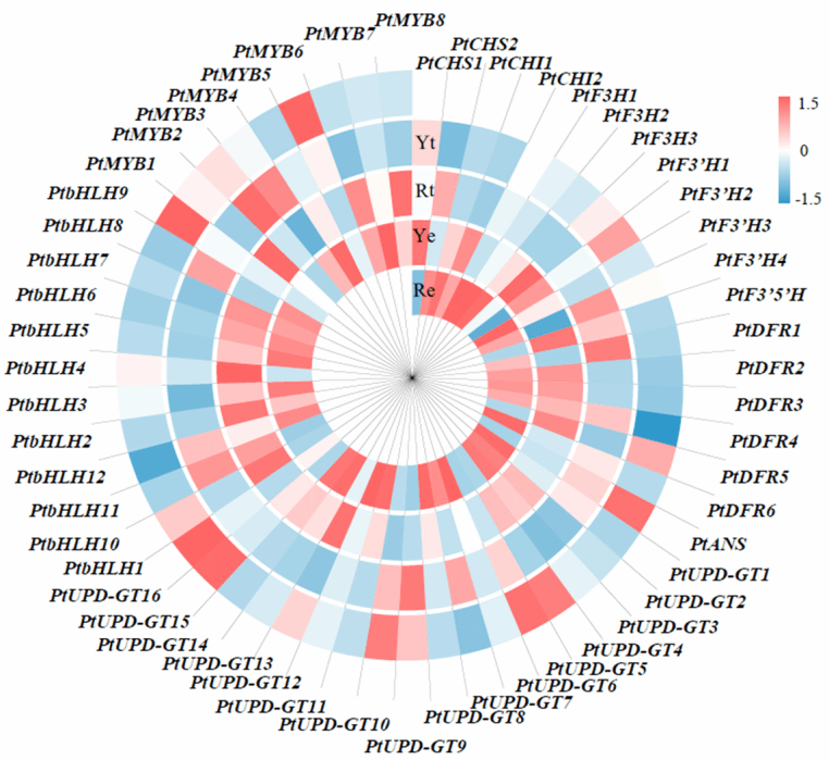 图3 Re、Rf、Ye和Yf中花青素生物合成相关DEGs的表达热图