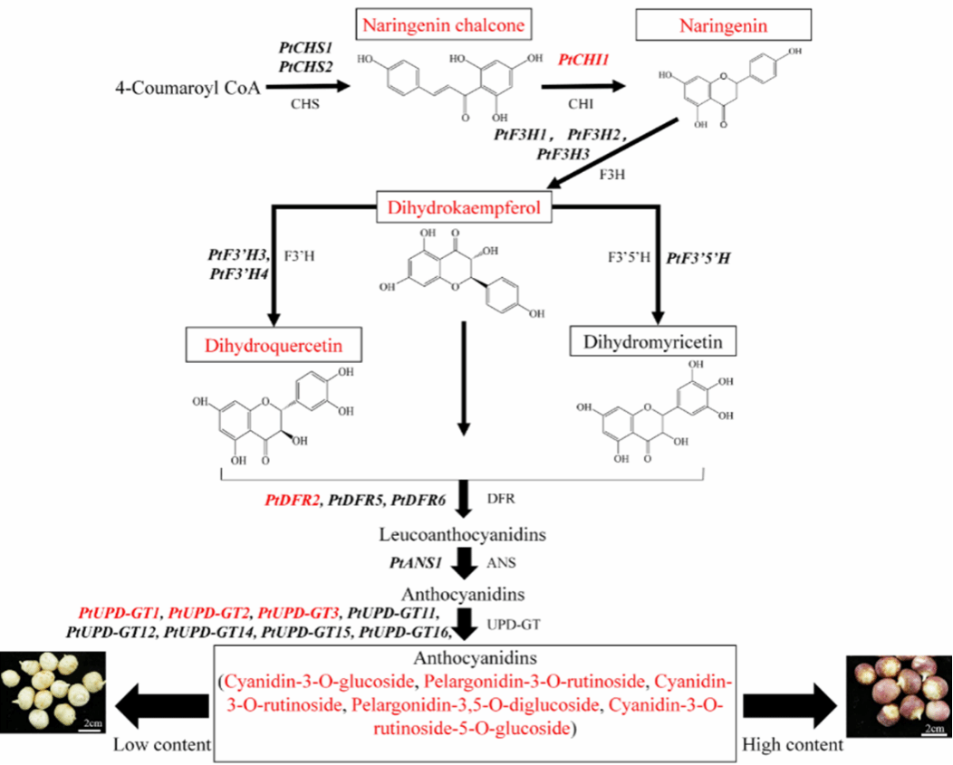 该研究首次基于全长转录组对二代测序数据进行校正,获得准确的基因和表达定量,联合转录组代谢组,更精准的对DEGs进行筛选,揭示半夏块茎表皮红色形成的分子机制,构建了半夏花青素生物合成路线图(图5)。并鉴定筛选了15个代谢产物,作为区分红色、黄色表皮半夏的潜在标记。研究认为PtCHI1、PtDFR2、PtUPD-GT1、PtUPP-GT2和PtUPD-GT3五个基因是半夏块茎表皮红色形成的关键基因;柚皮素查尔酮、柚皮素、二氢山奈酚和二氢槲皮素是半夏块茎表皮花青素累积的重要中产物。该文研究结果为半夏的分子育种和红、黄块茎的品系半夏的快速鉴定提供了理论依据。