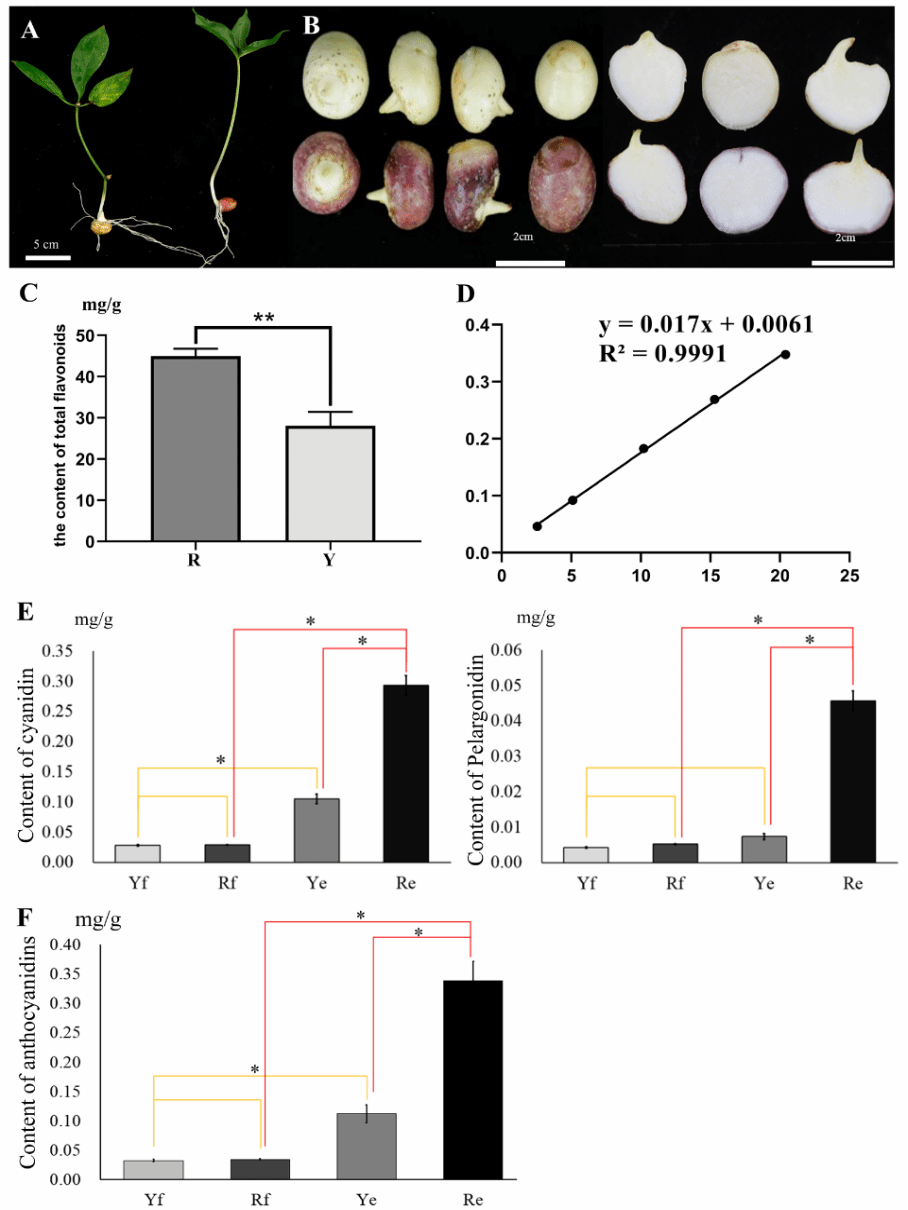 图1 红、黄半夏表、总黄酮及花青素含量差异比较(Yf-黄半夏块茎茎肉,Rf-红半夏块茎茎肉,Ye-黄半夏块茎表皮,Re-红半夏块茎表皮)