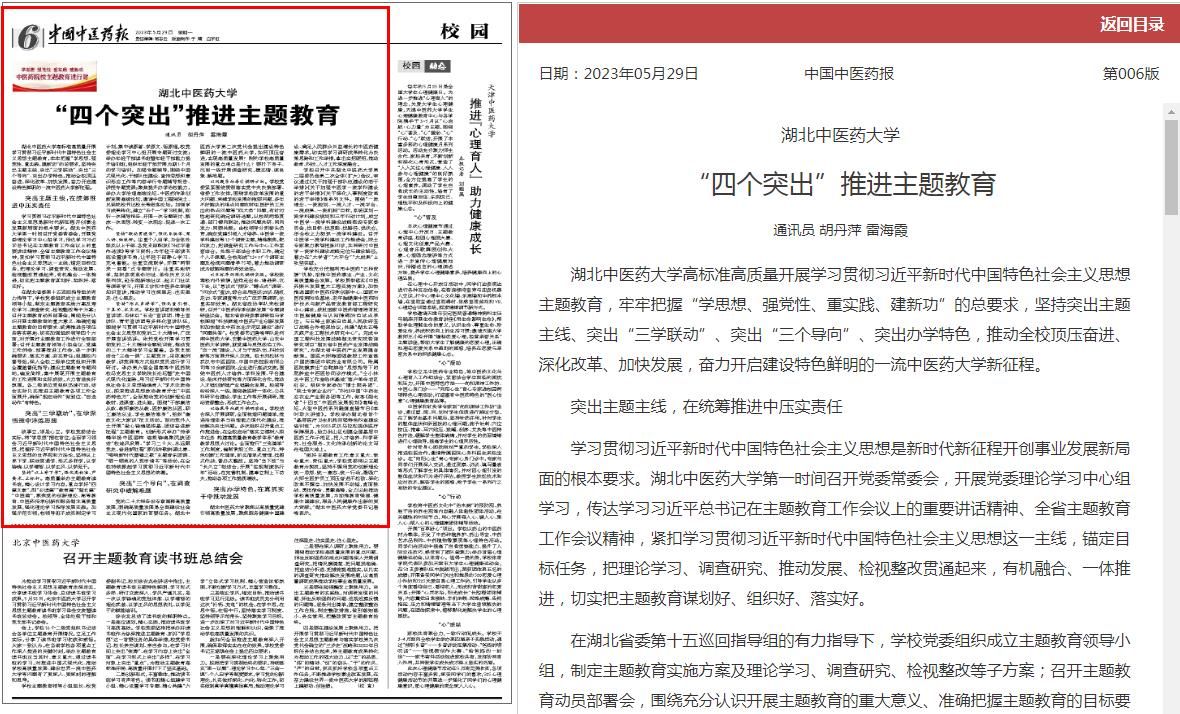 中国中医药报6版头条:湖北中医药大学“四个突出”推进主题教育