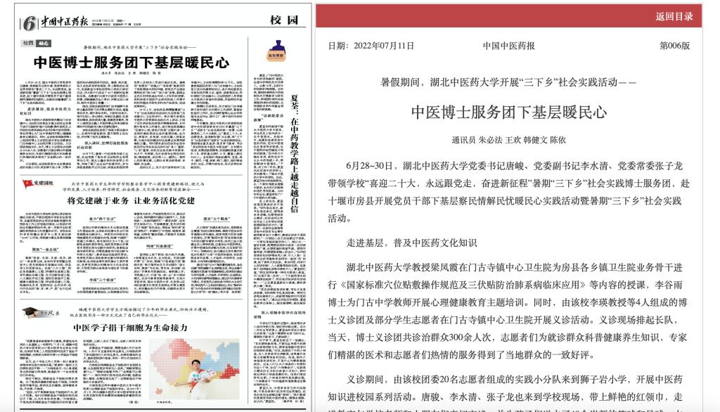 本网讯 7月11日,中国中医药报第6版头条以《暑假期间,湖北中医药大学开展“三下乡”社会实践活动——中医博士服务团下基层暖民心》为题,对我校开展党员干部下基层察民情解民忧暖民心实践活动暨暑期“三下乡”社会实践活动进行了详细报道。