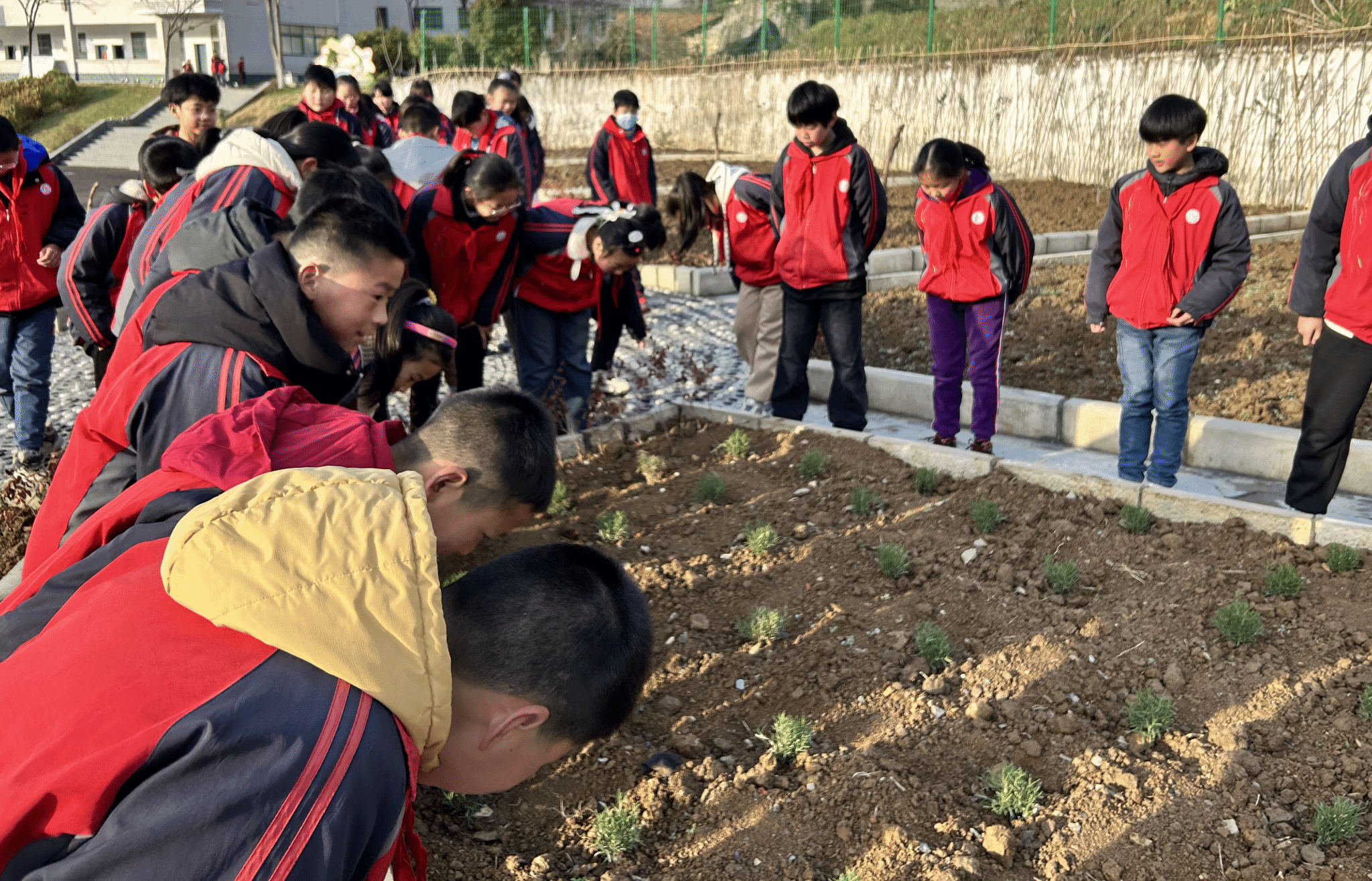 小学生课余时间在“百草园”观察中草药生长习性