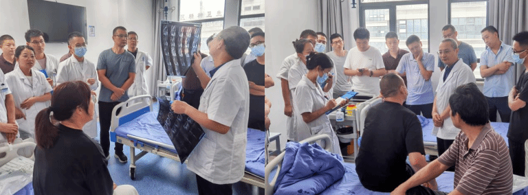 随后,彭锐教授带领志愿服务队在郧阳区中医医院子胥湖院区针康中心进行查房,为骨性关节炎患者治疗,并与科室医生就复杂病例进行深入交流研讨。