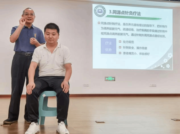 当天上午,同源点疗法治疗骨性关节炎学习班在郧阳区中医医院子胥湖院区开班。十堰市中医医院副院长黄斌,郧阳区卫生健康局公共卫生总师李忠,郧阳区中医医院领导班子,郧阳区乡镇卫生院、社区卫生服务中心针灸康复科、骨科医生及志愿服务队等近70人参加开班仪式。开班仪式后,彭锐教授结合教学和临床经验,开展“同源点疗法治疗骨性关节炎”中医药适宜技术培训,详细讲解了同源点的定义、分类及诊疗过程,并邀请医务人员进行实操演示。“这次培训让我学习意犹未尽,希望有机会去武汉彭教授的诊室继续观摩学习。”培训结束后,一位基层中医师饶有兴致地说。