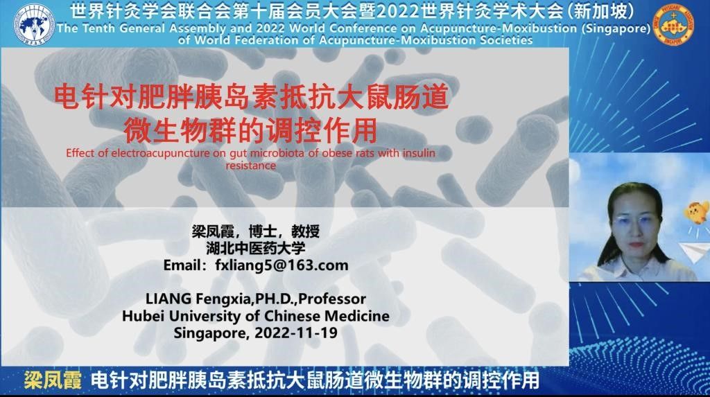 2022年11月18日-11月20日,世界针灸学会联合会第十届会员大会暨2022世界针灸学术大会在新加坡举办,来自40多个国家和地区的230名会员大会代表、观察员代表线上线下参会。我校梁凤霞教授、杜艳军教授、吴松教授和周华副教授分别在国际针灸传承与创新之青年论坛、现代针灸科研与临床学术论坛、国际针灸科普与健康之高峰论坛等不同分会场作学术报告。