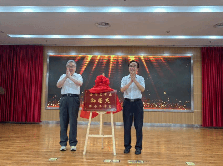 图为孙国杰教授与孝感市中医医院院长杨桂平共同为工作室揭牌