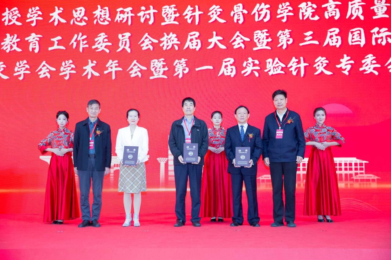 现场,世界针灸学会联合会秘书长杨金生、副秘书长殷海波,为世界针灸学会联合会教育工作委员会第三届中方主任委员王华教授,副主任委员、上海中医药大学沈雪勇教授、湖北中医药大学梁凤霞教授,颁发证书。