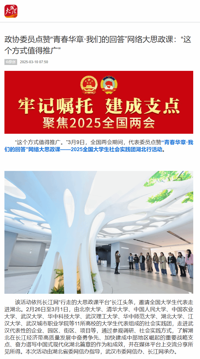 长江日报报道代表委员们点赞“青春华章·我们的回答”网络大思政课——2025全国大学生社会实践团湖北行活动中,马骏点赞此次活动是“大思政课”的生动实践。她说,“让大学生深入到基层,深入到企业一线,有利于点燃他们的创业理想,看到市场的真实需求,让他们更好地在大学投身于真正的创新研究。”