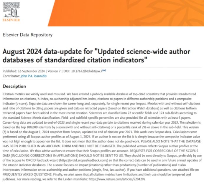 2024年9月16日,美国斯坦福大学(Stanford University)John P.A.Ioannidis教授团队发布全球前2%顶尖科学家榜单(World's Top 2% Scientists)。王华教授全国名老中医药传承工作室负责人梁凤霞教授,入选2024全球前2%顶尖科学家榜单。据悉,2024全球前2%顶尖科学家榜单基于Scopus数据库的引用数据系统分析,以被引数、H指数、HM因子等6种综合指标,根据“生涯影响力”和“年度影响力”从近700万名科学家中遴选出世界排名前2%的科学家,分为22个领域和174个细分子领域。榜单提供了面向科学家长期科研表现的衡量指标,客观真实反映科学家的学术影响力。