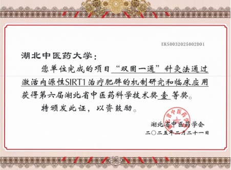 近日,从湖北省中医药学会传来喜讯,工作室负责人、湖北中医药大学针灸骨伤学院副院长、博士生导师、“岐黄工程”第四批全国中医优秀人才梁凤霞教授主持完成,工作室成员吴松教授等参与的《“双固一通”针灸法通过激活内源性SIRT1治疗肥胖的机制研究和临床应用》项目荣获第六届湖北省中医药科学技术奖一等奖。