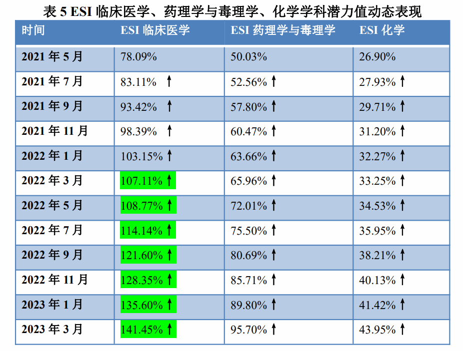 从2021年5月图书馆开始记录学校ESI学科发展潜力值情况至今,学校ESI临床医学、药理学与毒理学、化学学科潜力值都呈上升趋势。详见表5。