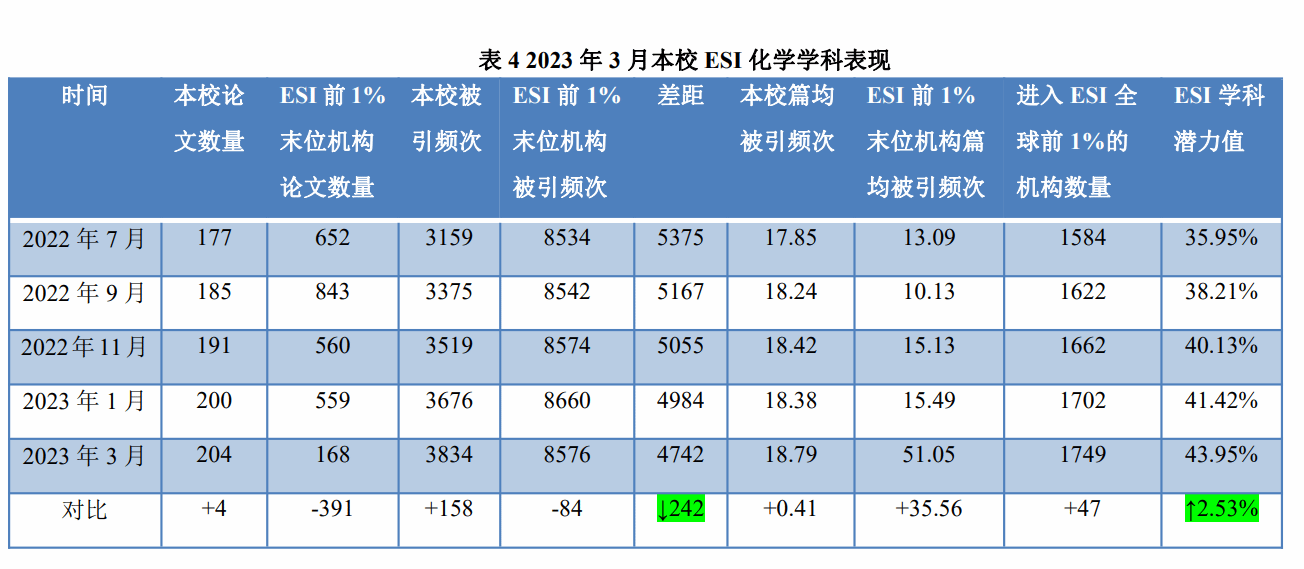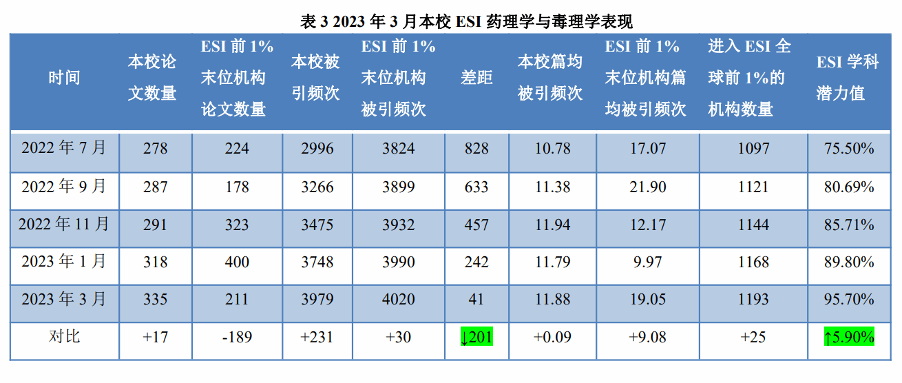 目前,我校其他21个ESI潜力学科中,药理学与毒理学、化学学科在学校所有学科中表现比较好。药理学与毒理学进步较大,比上一期上升了5.90%;化学学科比上一期上升了2.53%。具体数据见表3、表4。