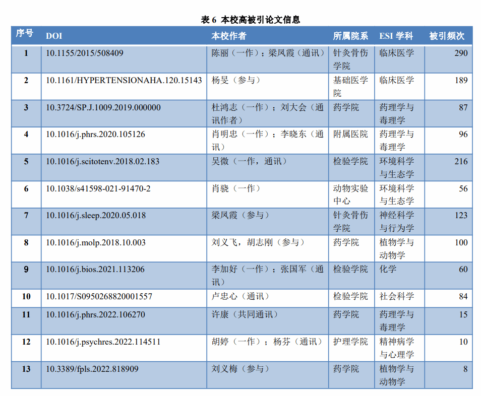 高被引论文(highly Cited papers)是指过去11年中所发表的论文,被引用频次在该学科中相同发表年的论文中排名前1%的论文。本期ESI数据显示,我校高被引论文比上期增加2篇,共13篇。表6具体列出本校高被引论文作者、所属院系及ESI所属学科。(论文11-13为新增高被引论文)