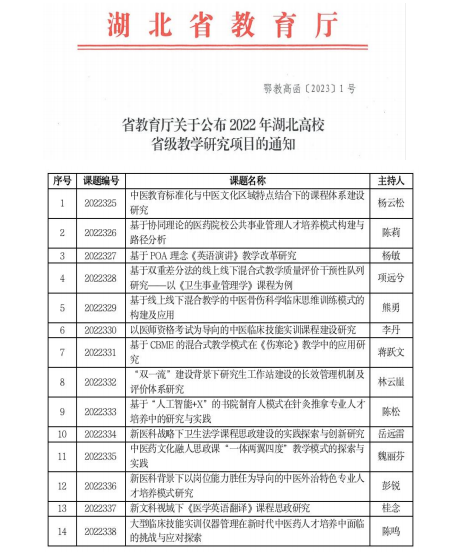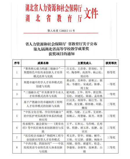 在第九届湖北省高等教育教学成果奖励工作中,学校获特等奖1项、一等奖2项、二等奖1项、三等奖4项,取得了历史上省级教学成果奖获奖数量、获奖等次“双突破”。一等奖数量位居全省省属高校前列。2项成果获推荐国家级教学成果奖申报资格,入围数量是历年来学校推荐进入国家级高等教育成果奖评选的最好成绩。14项课题获批省级教学研究项目立项,获批项目数为历年来最多。