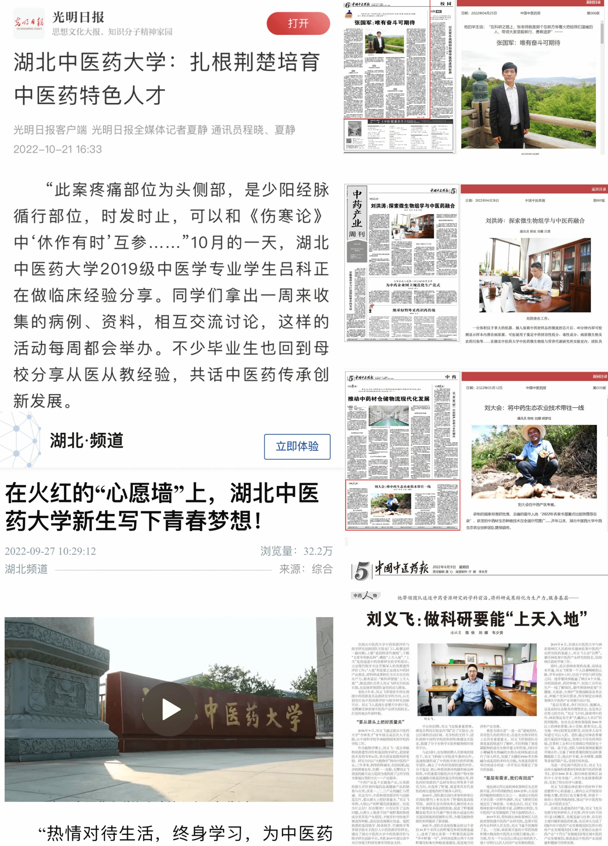 坚持选树典型,讲好奋斗故事、科研故事、育人故事。把宣传触角延伸到一线,深入挖掘身边师生典型事迹。专访高层次人才、科研团队、2022年国家自然科学基金、国家社会科学基金获得者等48人次,推出“奋斗者”“促进中医药传承创新发展”等专栏报道近40期。聚焦学生群体,围绕开学季、毕业季、迎新季,采写推出《优秀!湖北中医药大学学霸宿舍南4234炼成记!》《心系中医药!他们,与湖北中医药大学许下“杏林之约”!》等专题报道近20期,讲述杏林学子成长成才故事。