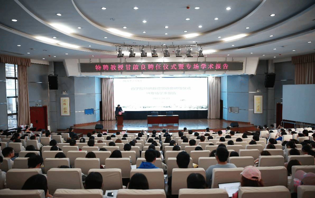 本网讯 10月23日,药学院特聘教授甘啟良聘任仪式暨专场学术报告在黄家湖校区明德楼学术报告厅举行。校长刘松林,副校长黄必胜,特聘教授甘啟良,学校相关职能部门负责人、药学院领导班子成员和师生代表参加仪式。仪式由黄必胜主持。