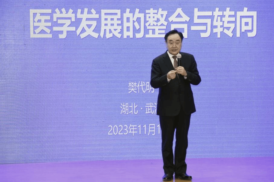 本网讯 11月10日,中国工程院院士樊代明做客我校第十六届濒湖论坛,作题为“医学发展的整合与转向 ”的学术报告。报告会采取线上线下相结合的形式,在昙华林校区老阶梯教室三楼学术报告厅设立主会场,在附属医院光谷院区、葛店院区、30多家医疗集团单位设立线上分会场。校党委副书记、附属医院党委书记陈刚主持报告会,副校长、附属医院院长何小明致欢迎词,附属医院、第一临床学院相关负责人及全体师生、医护、行政管理人员2000余人聆听报告。