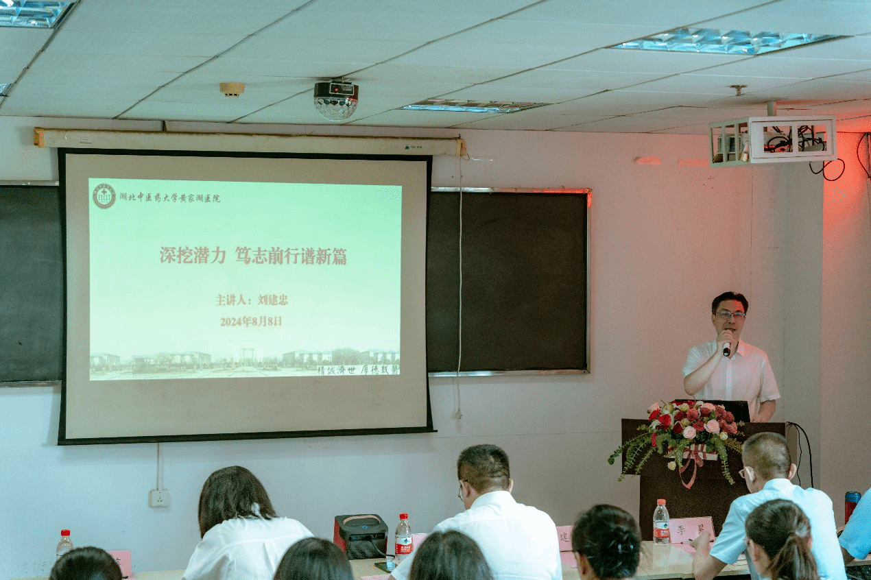 刘建忠围绕学习贯彻党的二十届三中全会精神讲授党课,领学了《中国共产党第二十届中央委员会第三次全体会议公报》,并作题为“深挖潜力 笃志前行谱新篇”的主题讲话。他回顾了黄家湖医院的发展历程,肯定了医院2024年上半年工作取得的成绩。针对医院发展面临的新机遇、新挑战、新局面,刘建忠提出五点要求,一是认识、重视,要抓落实,二是定位、目标,要明确任务,三是制度、流程,要抓执行,四是管理、培训,要有计划,五是服务、质控,要抓考核。他勉励医院全体职工坚定信心,凝心聚力,在校党委坚强领导下深挖潜力,笃志前行,谱写医院高质量发展新篇章。
