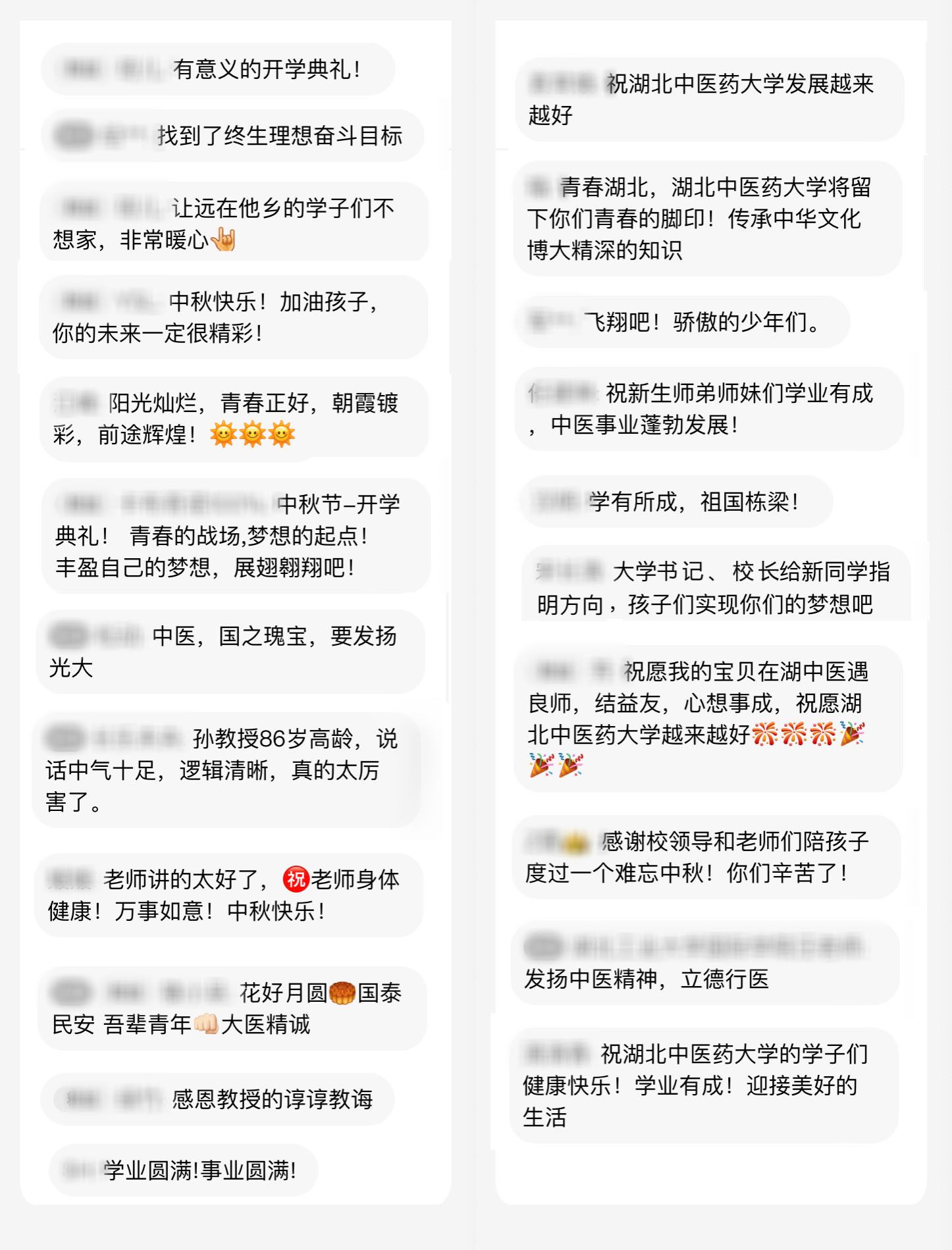 “感谢老师们陪孩子度过难忘中秋,让远在他乡的学子们不想家,非常暖心”“有意义的开学典礼”“祝新生师弟师妹学业有成,中医药事业蓬勃发展”……“湖北中医药大学视频号”直播间里,萌新、家长、校友纷纷留言,美好祝愿刷屏。