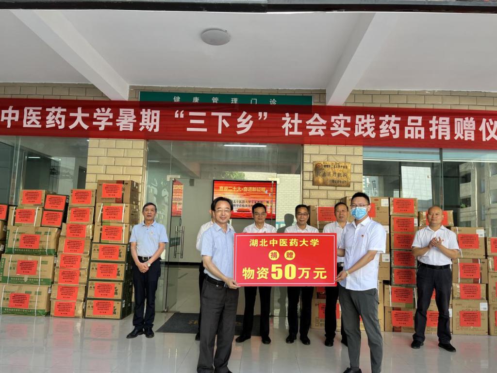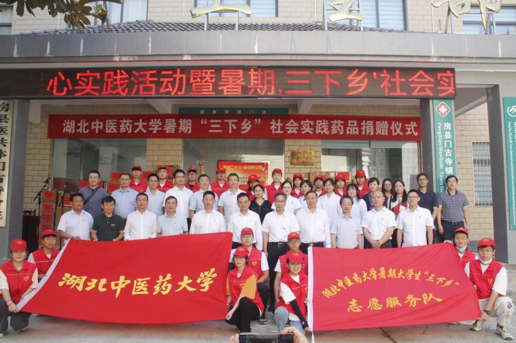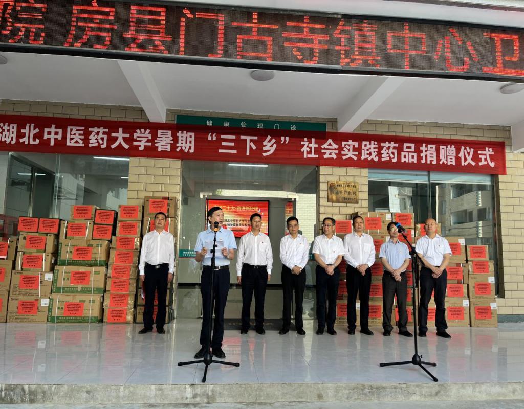 6月29日上午,湖北中医药大学药品捐赠暨暑期“三下乡”社会实践活动启动仪式在门古寺镇中心卫生院举行。唐峻、李水清、张子龙,十堰市卫生健康委员会主任、党组副书记彭力、房县县委书记纪道清、县政协主席董诠闻、县党委常委县委办主任林云国、县政府党组成员张贵峰、门古寺镇党委政府全体班子成员、门古寺镇中心卫生院全体职工、门古中学教师代表以及学校办公室、党委组织部、团委、黄家湖医院等部门负责人出席捐赠仪式。