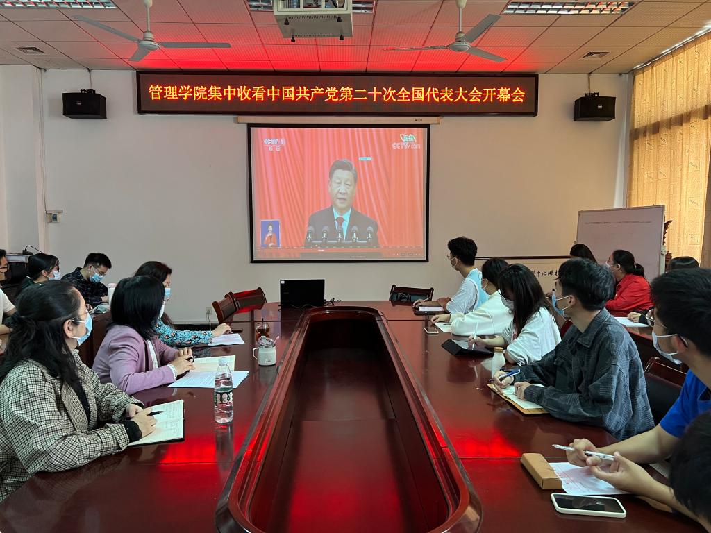 学校在黄家湖校区明德楼学术报告厅设立集中收看中国共产党第二十次全国代表大会开幕会主会场,校领导、校党委理论学习中心组成员、机关党委副处级及以上干部集中收看开幕会现场直播,认真聆听学习习近平总书记所作的报告。