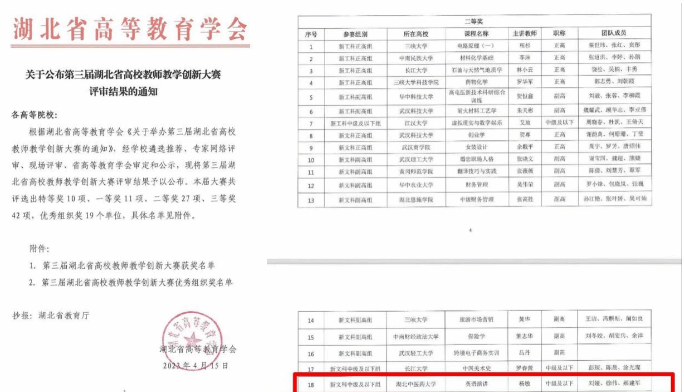 在校院两级共同大力支持下,《英语演讲》教学团队充分准备、沉着应战。经过激烈角逐,《英语演讲》教学团队顺利通过预赛网络评审,进入决赛现场汇报,全省仅36所高校90项课程作品入围现场评审。决赛中,杨敏老师出色完成了题为“基于中医药文化《英语演讲》教学创新与成效”创新成果的现场汇报,赢得专家高度认可,最终获二等奖。