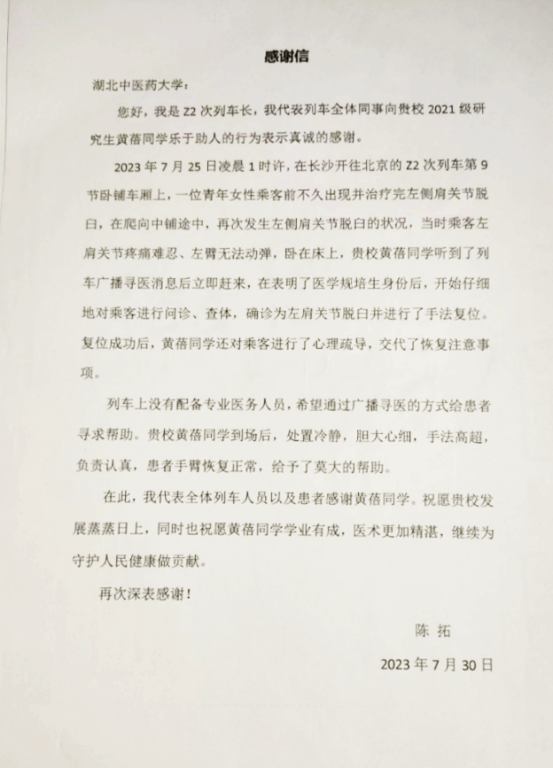 本网讯 近日,学校收到一封来自铁路局Z2次列车长陈拓的感谢信,来信中对我校第一临床学院2021级中西医结合专业研究生黄蓓同学在列车上利用专业知识治病救人的义举表示感谢。