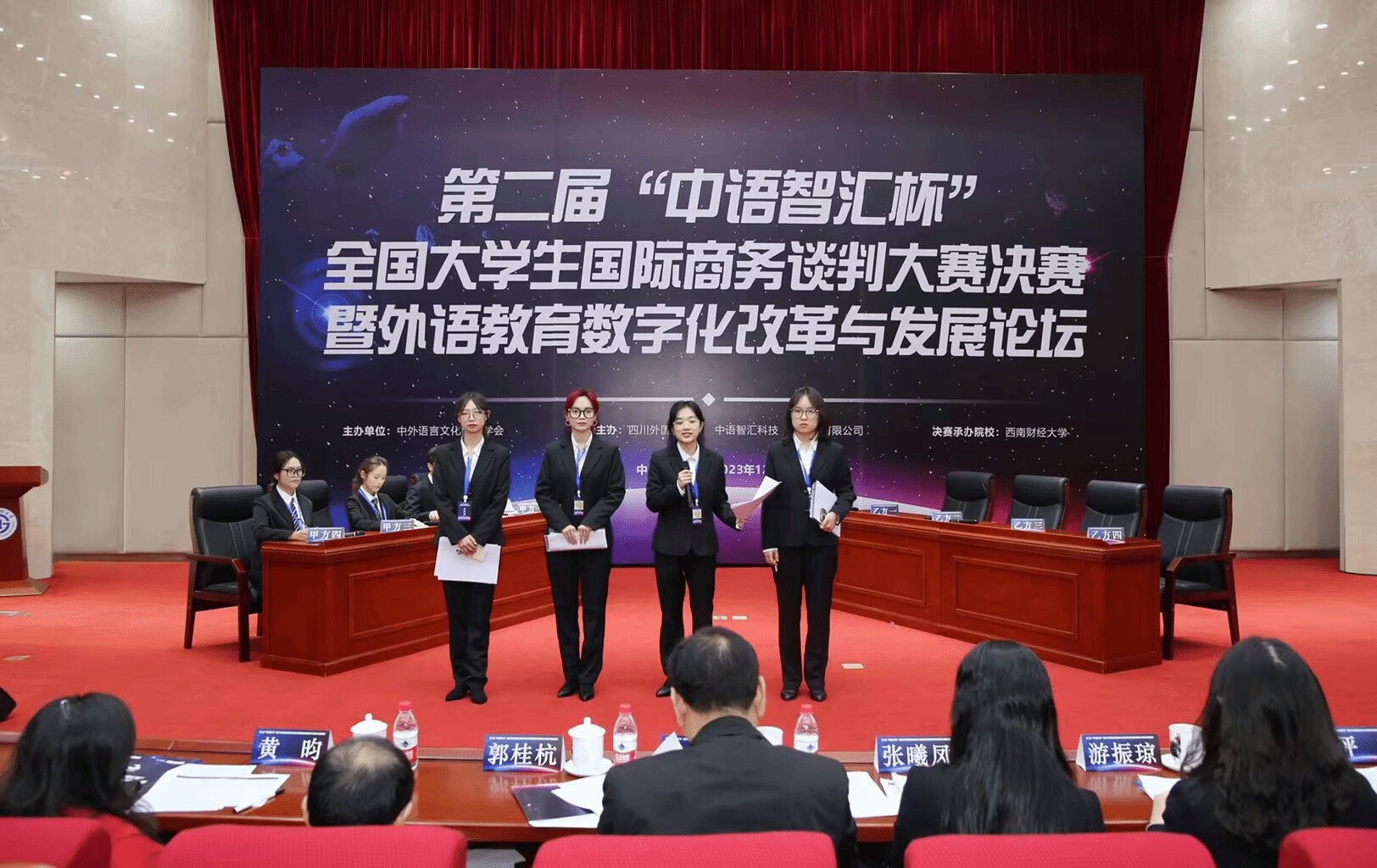 本网讯 12月4日,由中外语言文化比较学会主办,四川外国语大学和中语智汇科技(厦门)有限公司联合主办的第二届“中语智汇杯”全国大学生国际商务谈判大赛决赛在西南财经大学举行。来自全国42所高校队伍参加本科组比赛。我校外国语学院商务英语专业周思琦、刘逸、崔佳昕、李蝉蝉四位同学组成的团队在激烈的竞争中脱颖而出,斩获亚军。