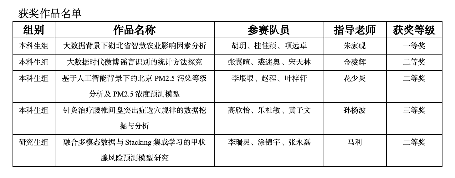 本网讯 近日,由中国统计教育学会联合教育部高等学校统计学类专业教学指导委员会主办的2024年(第十届)全国大学生统计建模大赛公布省赛获奖名单。我校以信息工程学院学生为主体的本科及研究生代表队获大赛湖北赛区本科生组一等奖1项、二等奖2项、三等奖1项及研究生组二等奖1项,展现了我校学子勇于创新、积极进取的精神风貌。