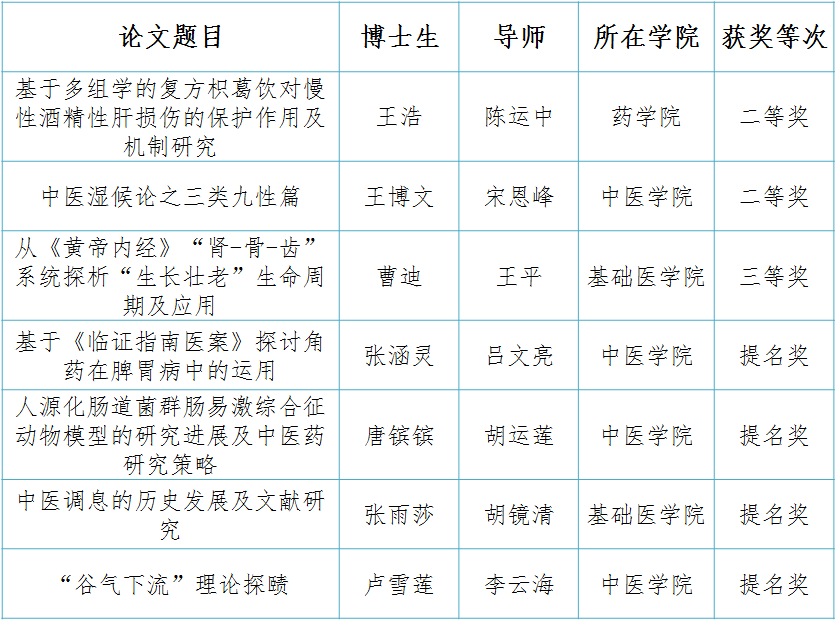 大赛共收到来自全国中医药高等院校、医疗机构、科研院所投稿论文906篇。经过评审,100篇优秀论文入围大赛决赛,其中40篇入围一、二等奖候选名单。经激烈比拼,我校共有7名博士生获奖,其中药学院王浩、中医学院王博文获大赛二等奖,基础医学院曹迪获三等奖,博士生张涵灵、唐镔镔、张雨莎、卢雪莲获提名奖,学校获评优秀组织单位。