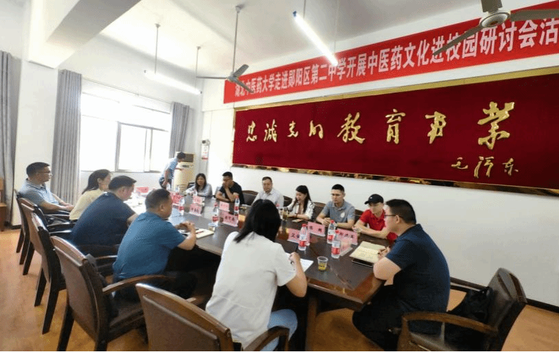 在郧阳区第二中学,志愿服务队分为三组开展服务。第一组中医药文化进校园研讨交流会在郧阳区第二中学如火如荼进行,郧阳区委宣传部、区教育局、区卫健局、区团委、区第二中学、区中医院等单位负责人参加会议。会上,我校团队围绕“中医药文化进校园‘进什么’‘怎么进’”进行发言;药学院张景景副教授就道地药材药用木瓜的认证、研发作报告。与会人员一致认为,郧阳中医文化底蕴良好、中药材资源优势独特,开展丰富多样的中医药文化进校园活动将有助于发挥中医药文化在立德树人中的独特作用。
