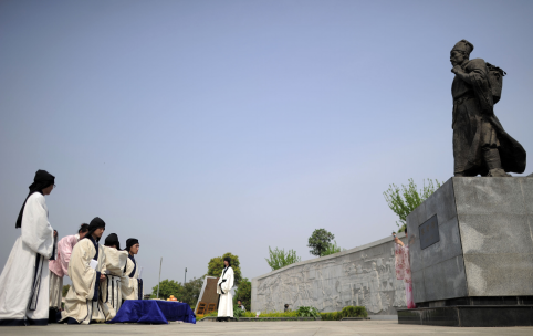 这张图,曾作为新华社通稿在全球发布,拍摄场景为:清明节时,学校全国优秀社团国学社的同学们在黄家湖校区李时珍广场行释菜古礼,祭奠李时珍。