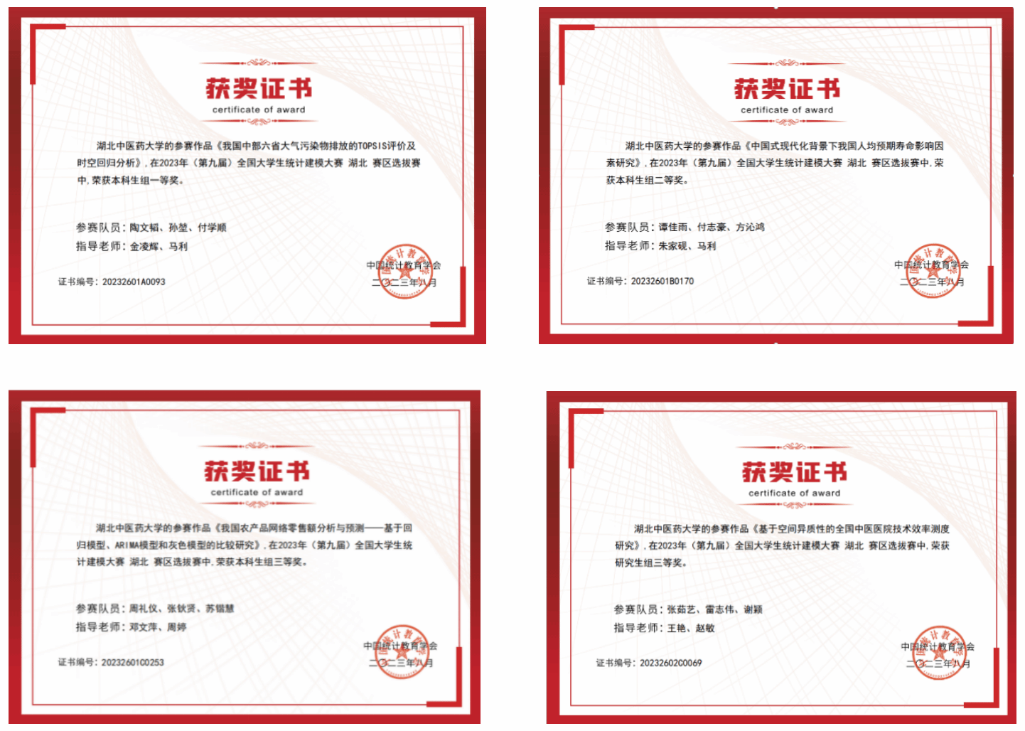本网讯 近日,由中国统计教育学会联合教育部高等学校统计学类专业教学指导委员会、全国应用统计专业学位研究生教育指导委员会主办的2023年(第九届)全国大学生统计建模大赛落下帷幕。本次大赛吸引全国613所院校共计11213支队伍参加,我校信息工程学院和基础医学院组成的本科及研究生代表队在本次大赛中获湖北赛区本科生组一等奖1项、二等奖2项、三等奖4项以及研究生组三等奖1项,获奖等级和数量均取得突破。