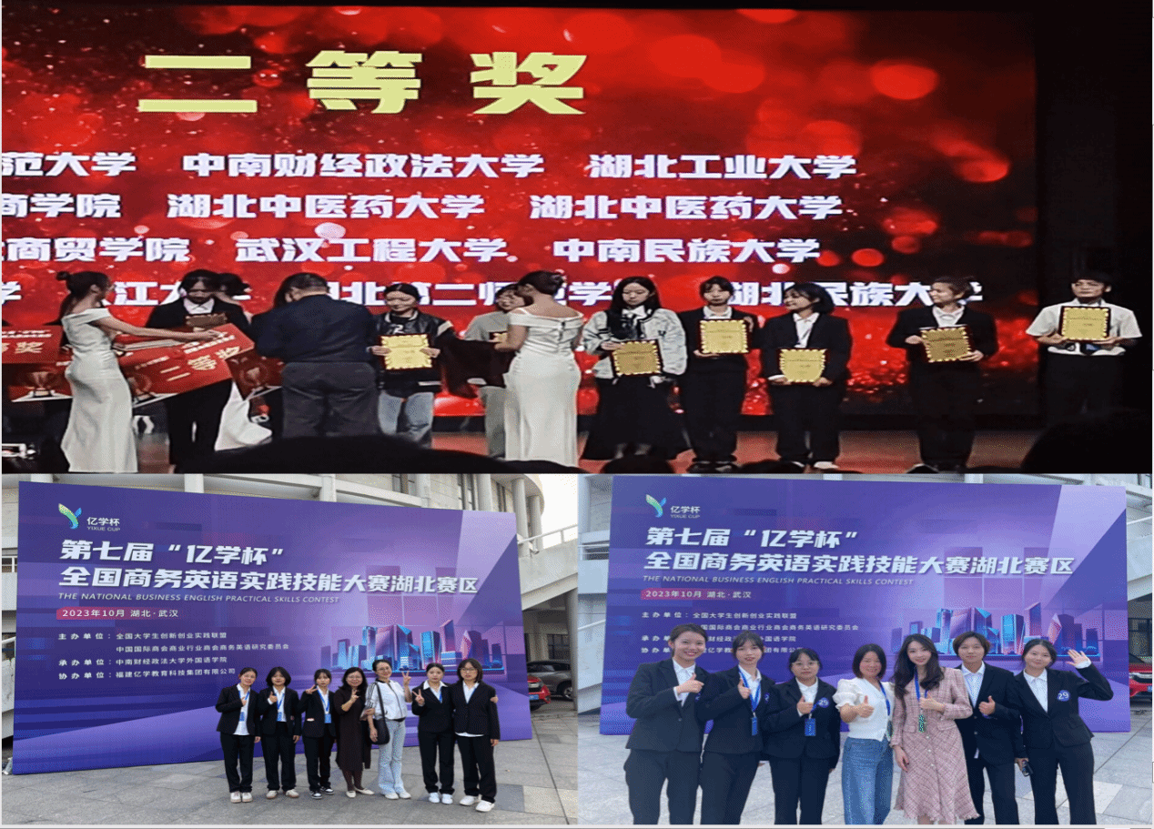 本网讯 近日,第七届“亿学杯”全国商务英语实践技能大赛(湖北赛区)决赛在中南财经政法大学举行。来自湖北省27所院校44支参赛队伍参与激烈角逐。各参赛队伍基于企业实践考察与数据采集,通过平台赛题测试和现场英文演讲两种方式进行评比和展示。我校外国语学院两支参赛队伍在刘璐、王红阳、余奕和温群芳老师的带领下,以“题材+逻辑+礼仪”三体合一的备赛要点为本,以清晰流利的语言表达和观众互动为纲,得到了赛事评委的高度肯定,获湖北省赛区决赛二等奖。