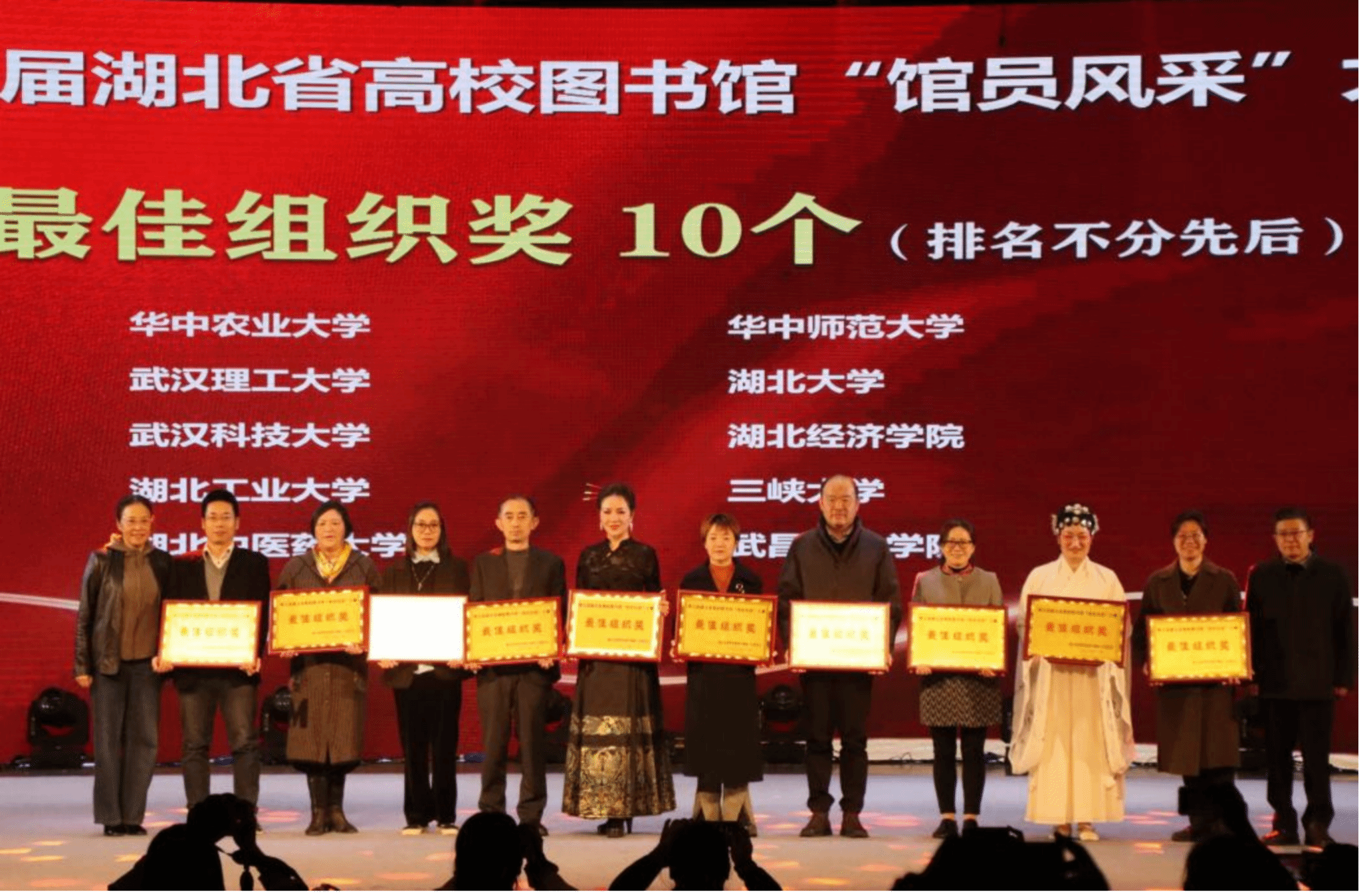 本网讯 11月17日,由湖北省高等学校图书情报工作委员会主办的第五届湖北省高校图书馆“馆员风采”大赛素养展示决赛在湖北大学举行。全省高校图书馆共有15个代表队进入素养展示决赛。我校图书馆在馆员信息素养线上答题环节获一等奖2项、二等奖4项、三等奖8项,组织的节目《杏林新风·古韵书香秀》获素养展示类节目二等奖,学校获大赛最佳组织奖。