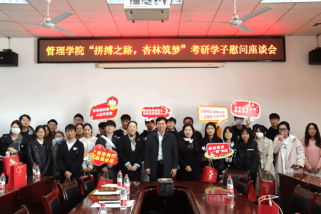 本网讯 12月8日,管理学院在文华楼B508会议室开展“拼搏之路,杏林筑梦”2024届考研学生慰问活动。学院领导班子,毕业班辅导员及考研学生代表参加活动。