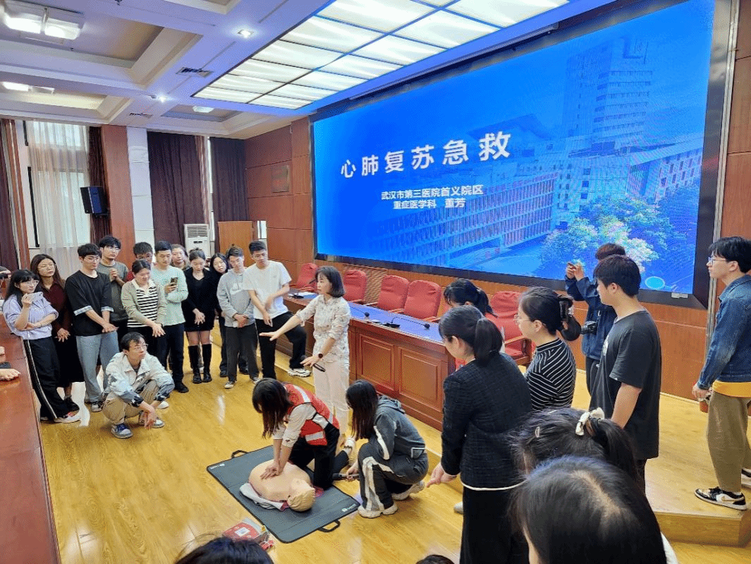 董芳介绍了心肺复苏的基本知识及操作要领,随后与周丽琴、邓淑萍一起现场示范,向师生们展示胸外按压、人工呼吸的正确方法,以及如何正确使用自动体外除颤器(AED)。示范结束后,师生代表在医生的指导下现场进行胸外按压演练和AED实操。