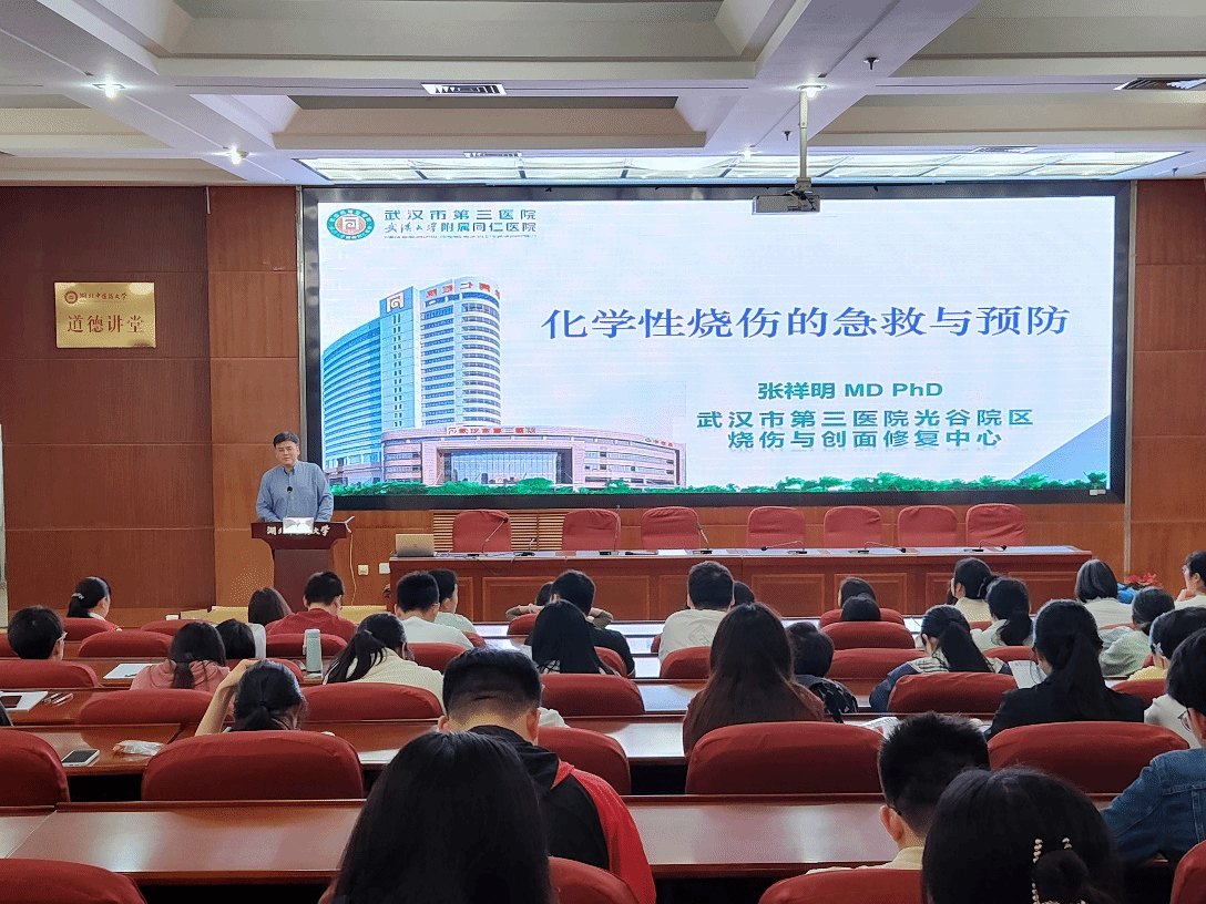 张祥明首先介绍了常见烧伤灼伤的分类、预防及急救措施,针对实验室化学品灼伤,重点介绍了“冲、脱、泡、盖、送”五字诀应急处置流程及方法,号召师生认真学习实验室安全守则,进入化学实验室前做好个人防护,一旦发生灼伤事故,根据不同化学品采取相应处置,将伤害程度降到最低,并尽快到专科医院就诊。