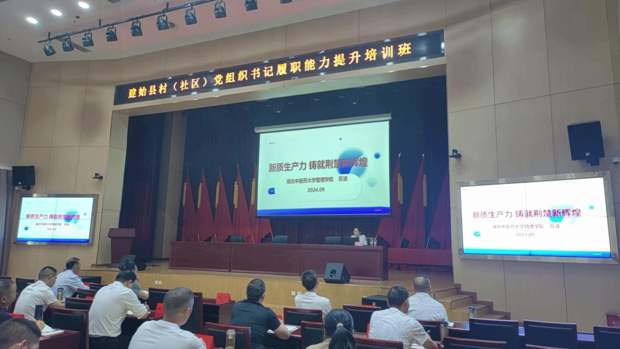 本网讯 9月26日,管理学院苏波教授应邀为建始县村(社区)党组织书记履职能力提升班学员作题为“加快发展新质生产力,扎实推进湖北高质量发展”的专题讲座,旨在深化基层党员干部对新质生产力的理解,并探讨新质生产力在推进湖北高质量发展中的作用。