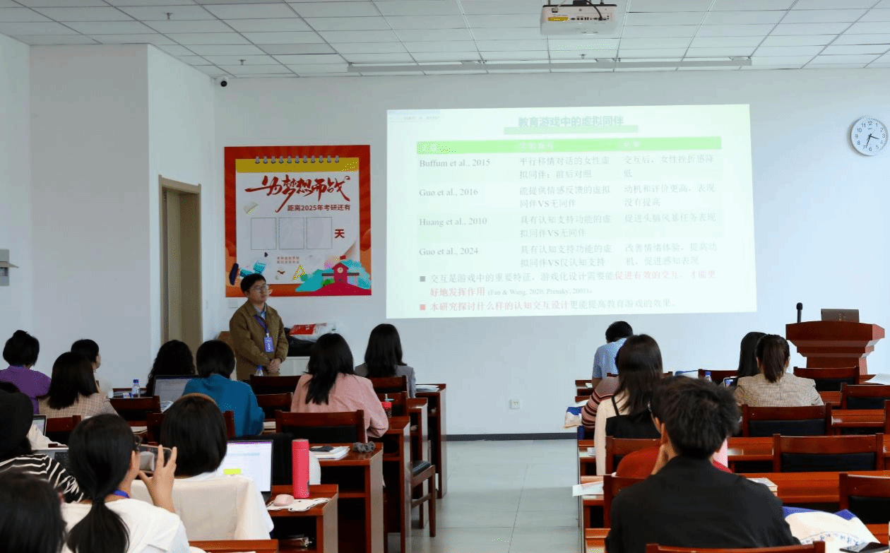 本届会议主题为“教育心理学助力教育强国建设”,共有特邀报告3场,专题报告4场,青年教师论坛4场,硕博论坛6场。曹阳副教授以“教育游戏中虚拟同伴和学习者的认知交互对学习的影响”为题作报告,首先从日常生活中的娱乐游戏入手,引出教育游戏以及虚拟同伴的概念,随后详细介绍了其研究团队基于教育心理学理论和研究构建的“学习者与虚拟同伴的认知交互影响游戏化学习体验和效果”的理论模型,以及着眼于该理论模型开发的教育游戏,并分享了在此基础上开展的系列实证研究和相关研究成果。研究揭示了教育游戏中虚拟同伴的认知反馈和学习者的认知反思对于学生学习效果的促进作用,为教育游戏领域的理论建构和实践探索提供了重要的参考。报告获得了与会专家、学者的广泛关注与高度评价,现场反响热烈。