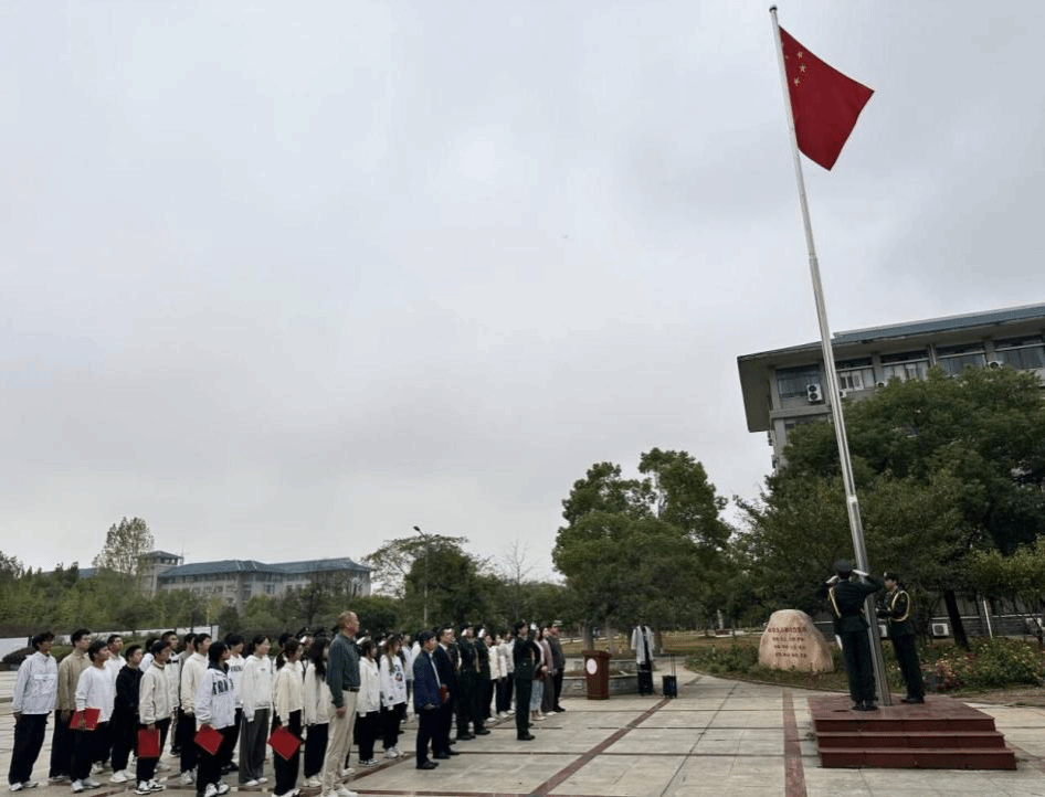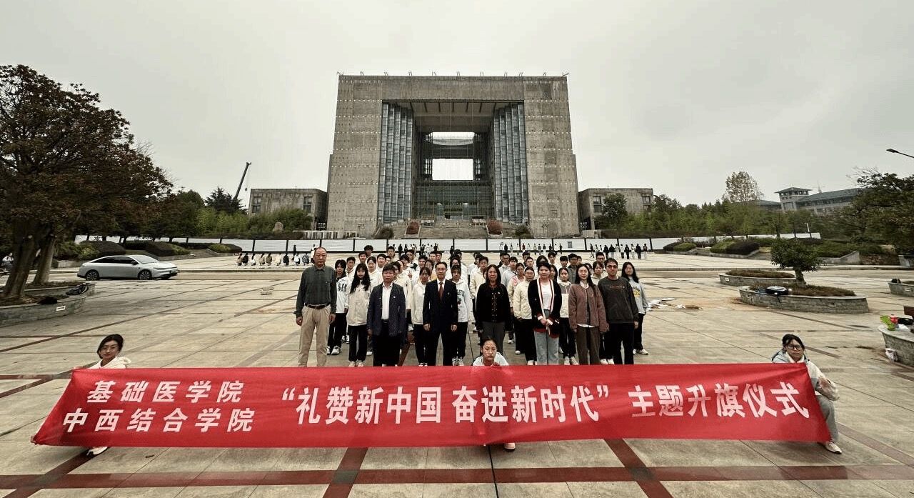 本网讯 为引导青年学子深入学习宣传贯彻习近平新时代中国特色社会主义思想,厚植爱国情怀,10月21日,基础医学院在黄家湖校区图书馆广场举行“礼赞新中国,奋进新时代”主题升国旗仪式。副校长刘建忠,基础医学院领导班子、党支部书记代表、辅导员以及2024级中西医临床5+3班全体同学参加活动。