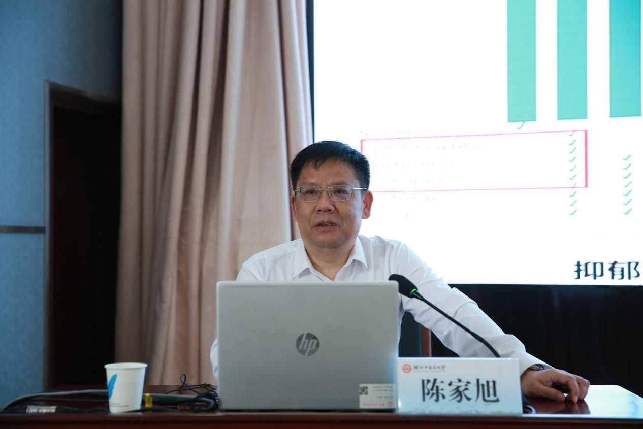 本网讯 5月17日,北京中医药大学陈家旭教授受邀到学校“中医药传承创新发展高端论坛”(第九期),以“基于肠脑稳态的逍遥散抗抑郁作用机制及药效物质基础研究”为题作报告。会前,校长刘松林会见了陈家旭教授。报告会在黄家湖校区明德楼学术报告厅举行,昙华林校区设视频分会场,校领导、中层干部、教医研领域骨干代表、学生代表聆听报告。报告会由副校长刘建忠主持。
