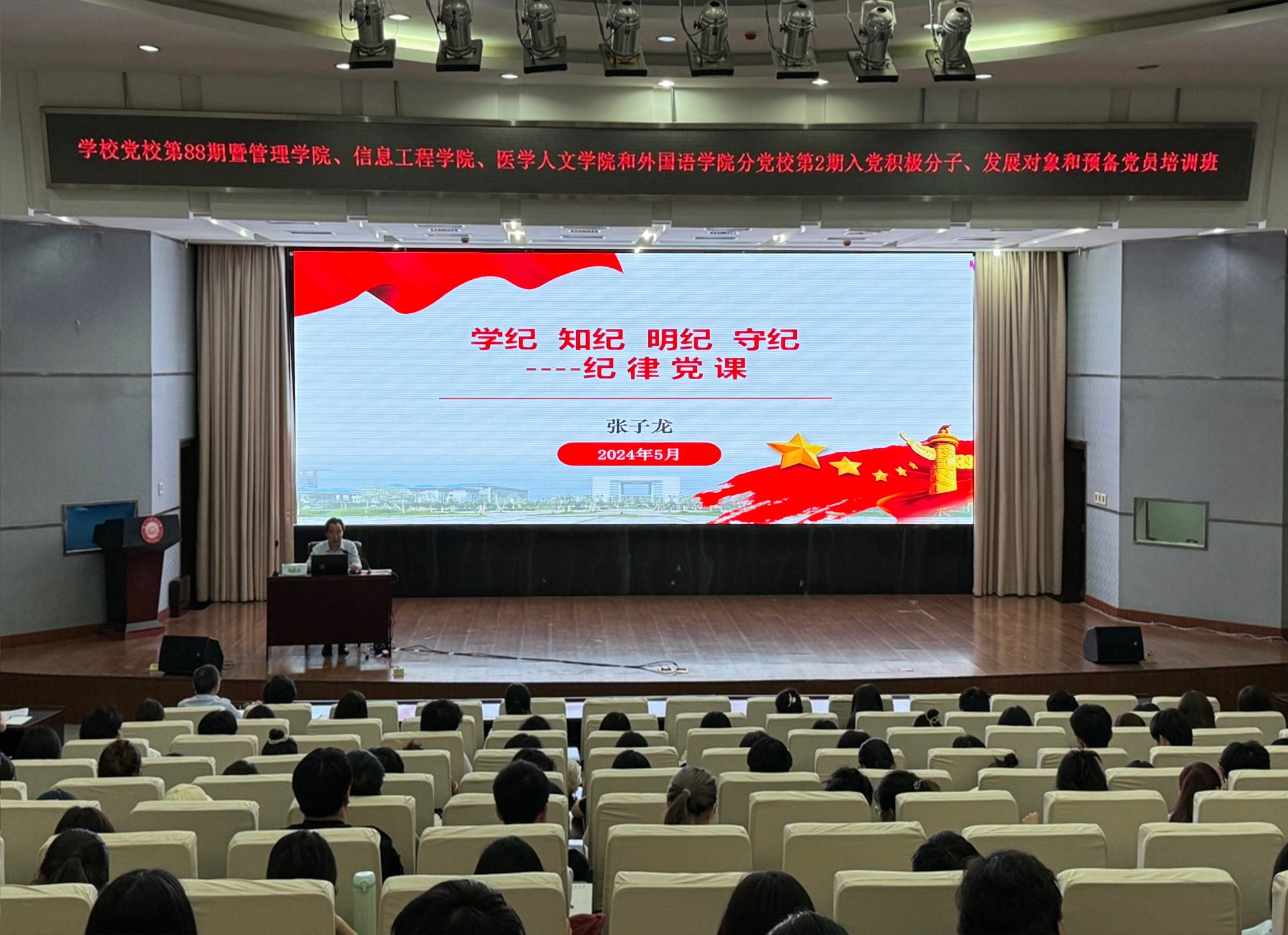 本网讯 5月24日,学校党校第88期暨管理学院、信息工程学院、医学人文学院和外国语学院分党校第2期入党积极分子、发展对象和预备党员培训班在黄家湖校区明德楼学术报告厅举行。校党委副书记张子龙以“学纪 知纪 明纪 守纪”为题,为培训班学员讲授纪律专题党课。管理学院、信息工程学院、医学人文学院和外国语学院领导班子成员、教师代表,全体发展对象、预备党员聆听党课。培训班由管理学院负责人主持。