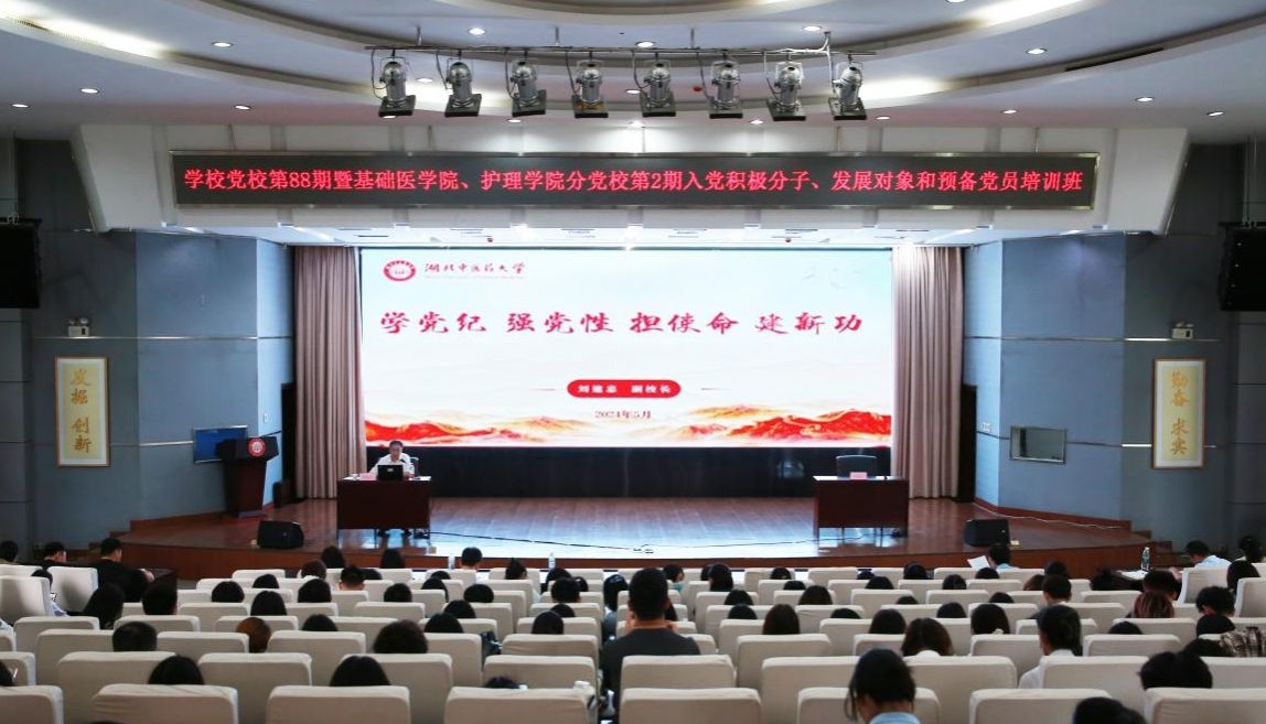 本网讯 5月29日,学校党校第88期暨基础医学院、护理学院分党校第2期入党积极分子、发展对象和预备党员培训班在黄家湖校区明德楼学术报告厅举行。副校长刘建忠以“学党纪 强党性 担使命 建新功”为题,为培训班学员讲授纪律专题党课。基础医学院和护理学院领导班子成员、教师代表,全体入党积极分子、发展对象和预备党员聆听党课。培训班由护理学院负责人主持。
