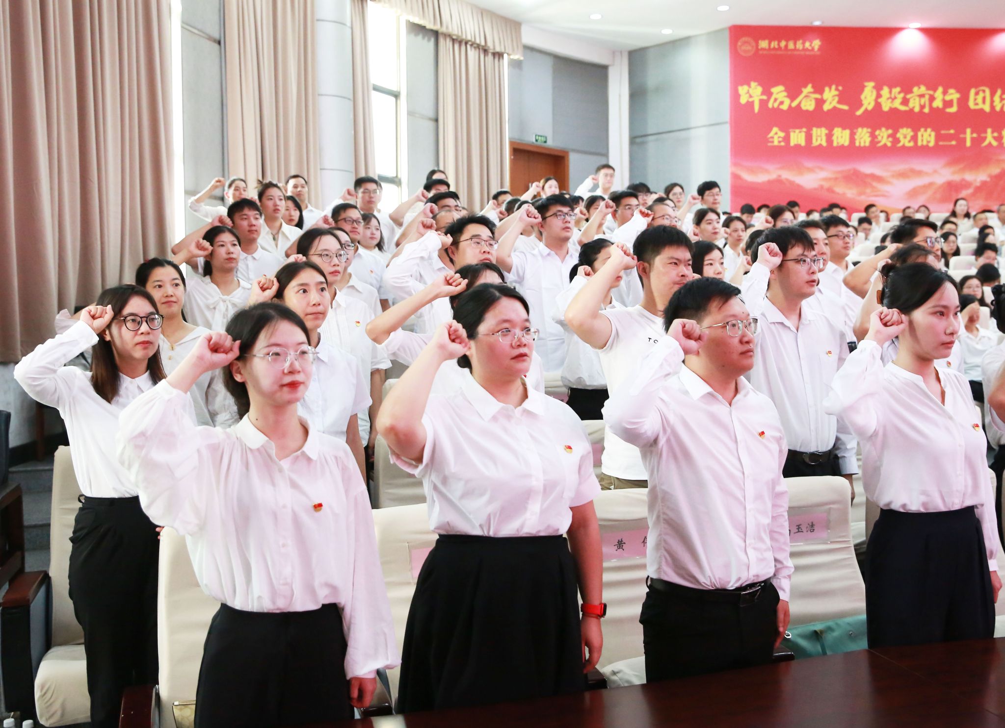 现场,新进教师进行庄严宣誓,将忠诚于党和人民的教育事业,全面贯彻党的教育方针,履行教师神圣职责,恪守教师职业道德,遵守《湖北中医药大学章程》,秉承“勤奋 求实 发掘 创新”校训精神,不忘立德树人初心,牢记为党育人、为国育才使命,为培养合格的社会主义建设者和接班人奋斗终身。