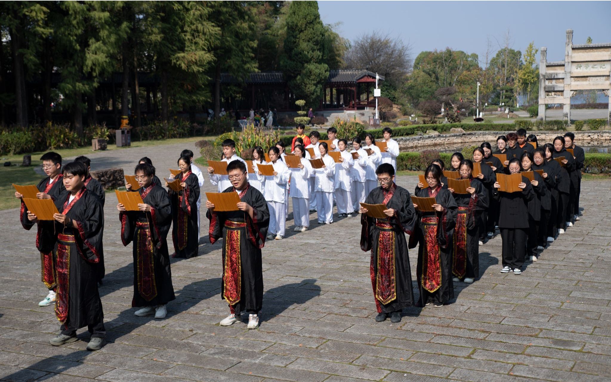 上午10时,仿古祭祀典礼在李时珍纪念馆举行。药学院时珍国药班同学通过太极展演和还原古代祭礼仪式,以醴酒、时鲜、菊花进行四拜四兴,完成迎神、奠花、初献、亚献、终献、撤馔、共献华章、撤班礼成八个祭祀步骤,并集体诵读《本草纲目》章节,共同缅怀一代先贤,弘扬时珍精神。