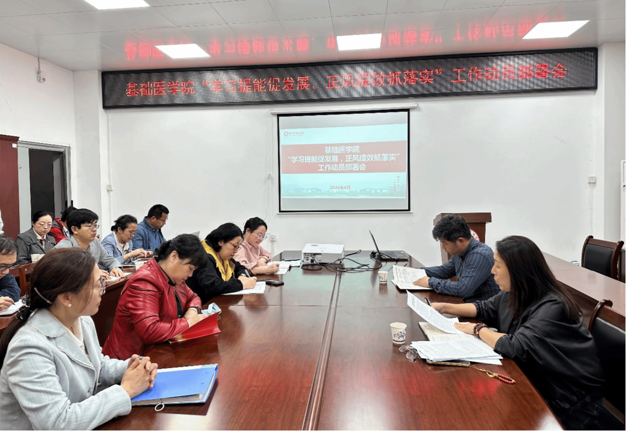 本网讯 4月2日,基础医学院党委在黄家湖校区杏林阁D103会议室召开专题会议,传达学习学校2024年能力提升年、作风建设年动员部署会会议精神,对学院贯彻落实工作开展作出研究安排。学院领导班子、党支部书记、教研室主任、学科负责人、科研团队代表、“两代表一委员”、民主党派代表、高层次人才代表参会。会议由基础医学院党委负责人主持。