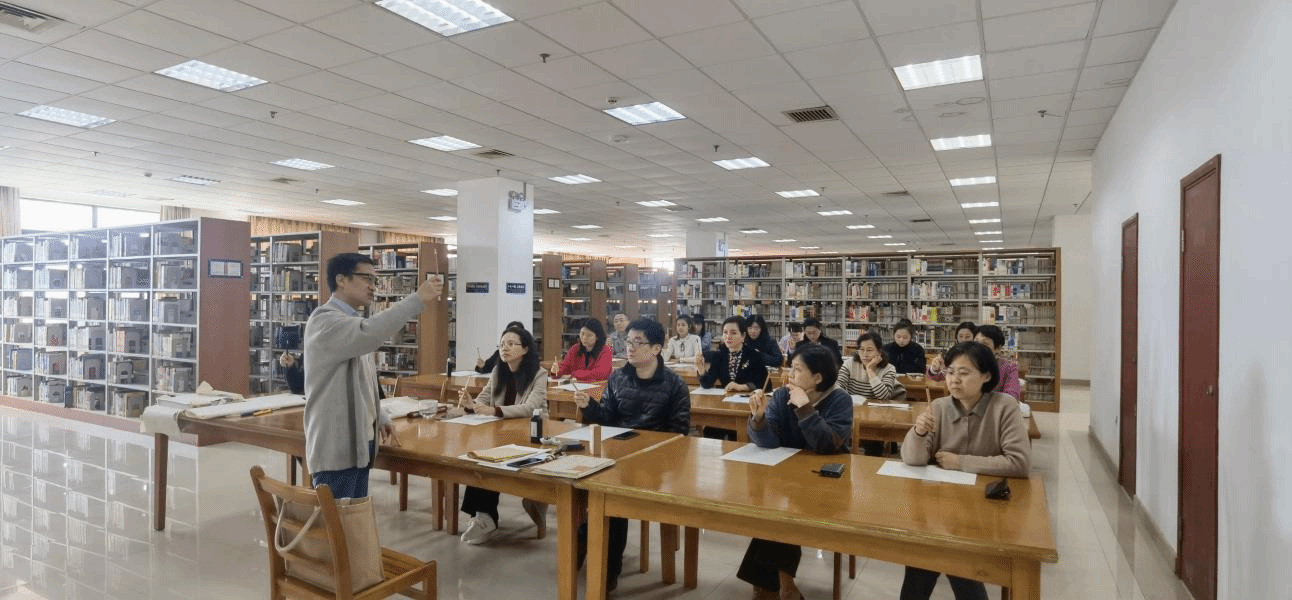 “吾家洗砚池头树,个个花开淡墨痕。不要人夸好颜色,只流清气满乾坤。”柳叶副教授以诗开篇,向馆员们介绍学习书法的意义,从握笔姿势、笔墨纸砚的特点、开笔转墨等方面进行详细指导。元代青花“四爱图”梅瓶的故事让大家走进才子高士的生活,笔冢和惜字炉的典故让大家感受到文人墨客的情怀。