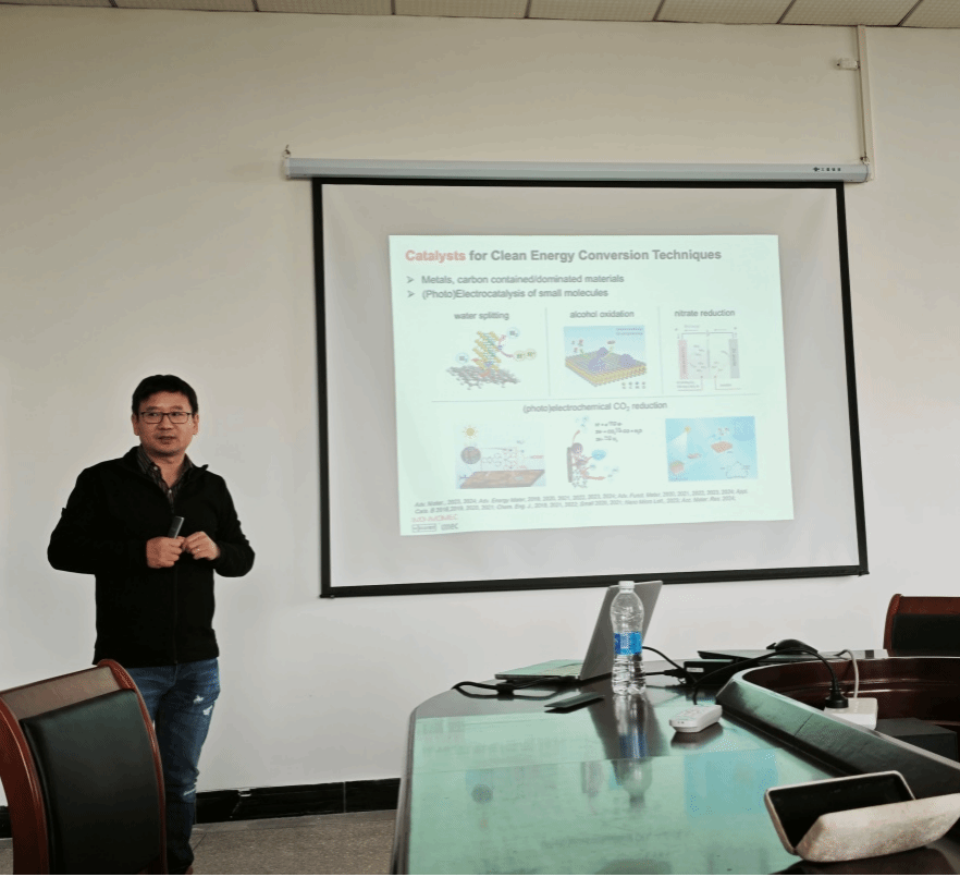 报告会中,杨年俊教授分享了团队在导电金刚石薄膜及其复合材料方面取得的进展,重点介绍了在生物传感、电化学能量存储及转换等领域工作,详细讲解了蛋白质的直接电化学、DNA生物传感、具有高功率和能量密度的超级电容器、电催化和构建柔性锌空气电池等知识及应用。并同与会教师讨论了金刚石化学的未来研究方向。